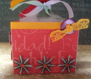 Outro detalhe da caixinha, com botões, fita, sianinha, cristais e rosas de papel com tinta glitter.