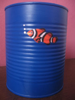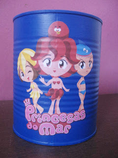 Aqui temos o centro de mesa, feito de lata de leite em pó e com as princesas do mar recortadas, tendo ainda uns peixinhos na parte de trás. Amei fazer essa encomenda.