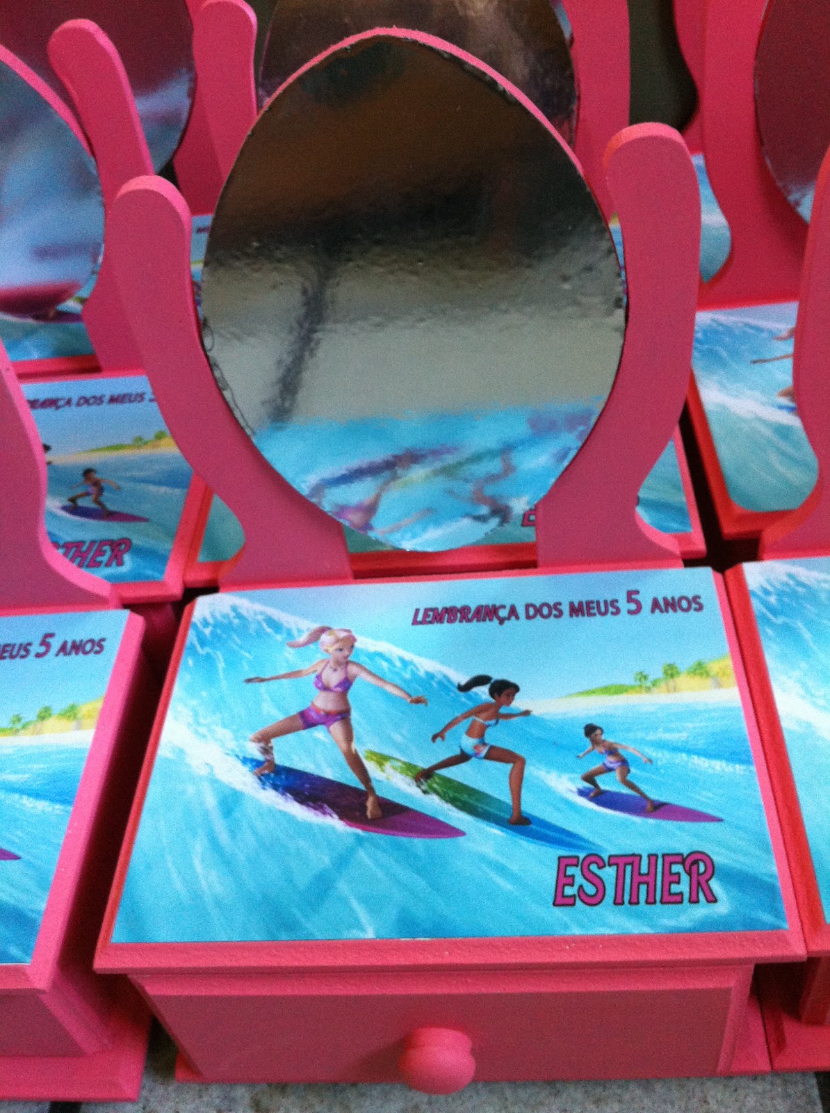 Dentro da penteadeira a mamãe colocou chocolate personalizado.